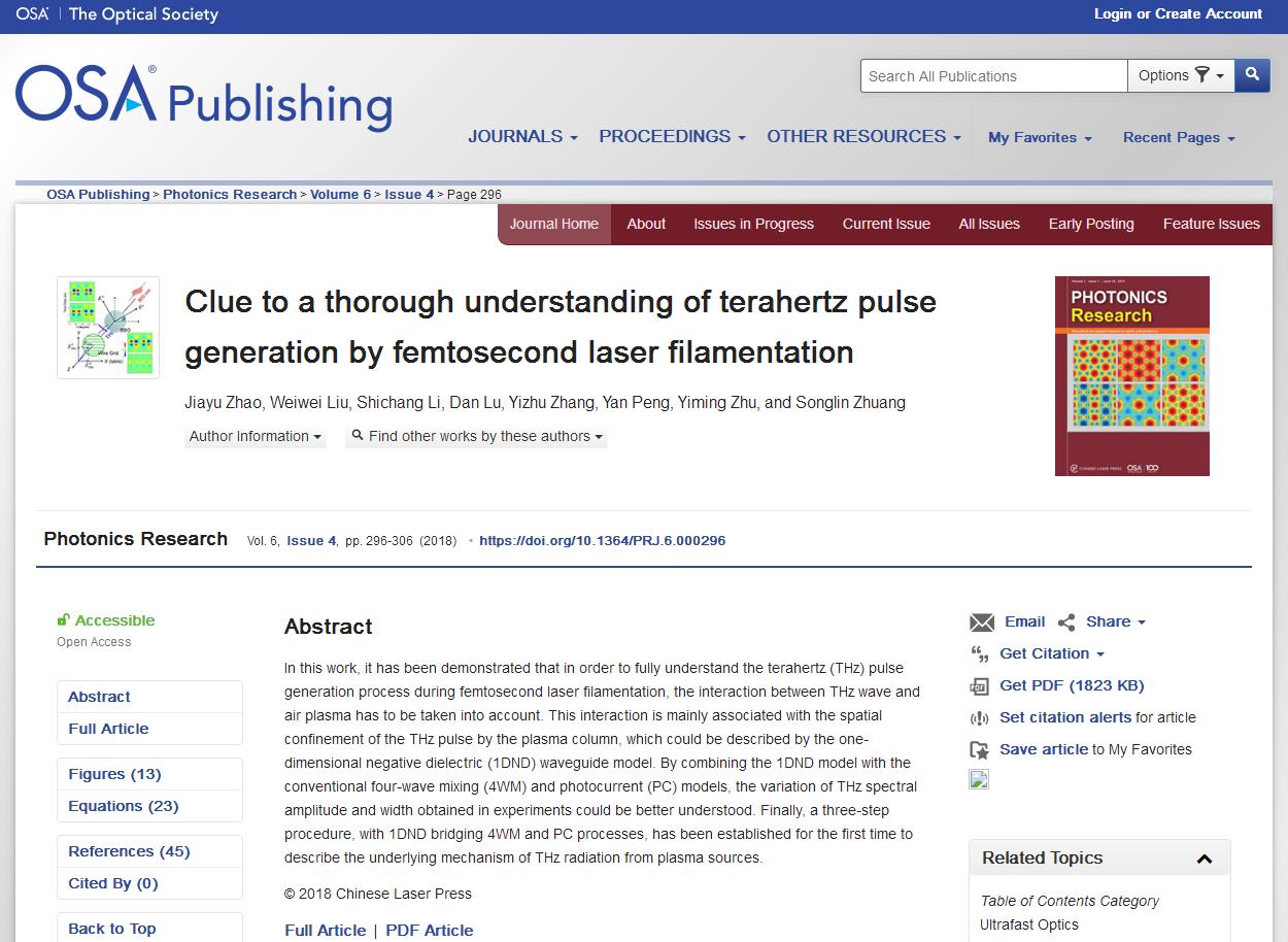 Recently, Professor Zhu Yiming's research group of Terahertz Technology Innovation Institute of Shanghai University of science and technology and director Liu Weiwei of Nankai University published the title of "clue to a rough understanding of terahertz pulse generation by femtosecond laser filtration" in the international high-level optical journal Photonics Research [photo. Res. 6 (4), 296-306 (2018)]. Zhao Jiayu, a young lecturer at the Terahertz Institute,is the first author, and Professor Liu Weiwei, Professor Peng Yan and Professor Zhu Yiming are co authors.