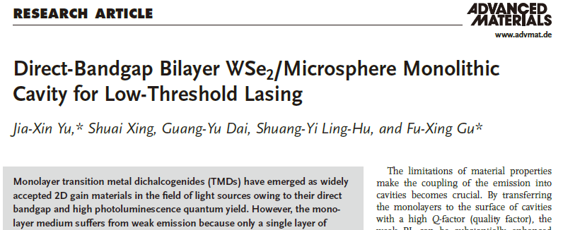Recently, A team led by Academicians Zhuang Songlin and Professor Gu Fuxing from the Future Optics Laboratory published a report entitled "Direct-Bandgap Bilayed-tungsten Selenide (WSe2)/ Microsphere-One Body Cavity for a low Threshold Laser" on an international top journal Advanced Materials (Impact factor 30.849) Bilayer WSe2/Microsphere Monolithic Cavity for Low-Threshold Lasing "). This paper is co-authored by Professor Gu Fuxing and Associate Professor Yu Jiaxin. Associate Professor Yu Jiaxin and doctoral student Xing Shuai are co-lead authors. The program design, experiment and simulation work of this research work are all completed in the Future Optics Laboratory of University of Shanghai for Science and Technology.