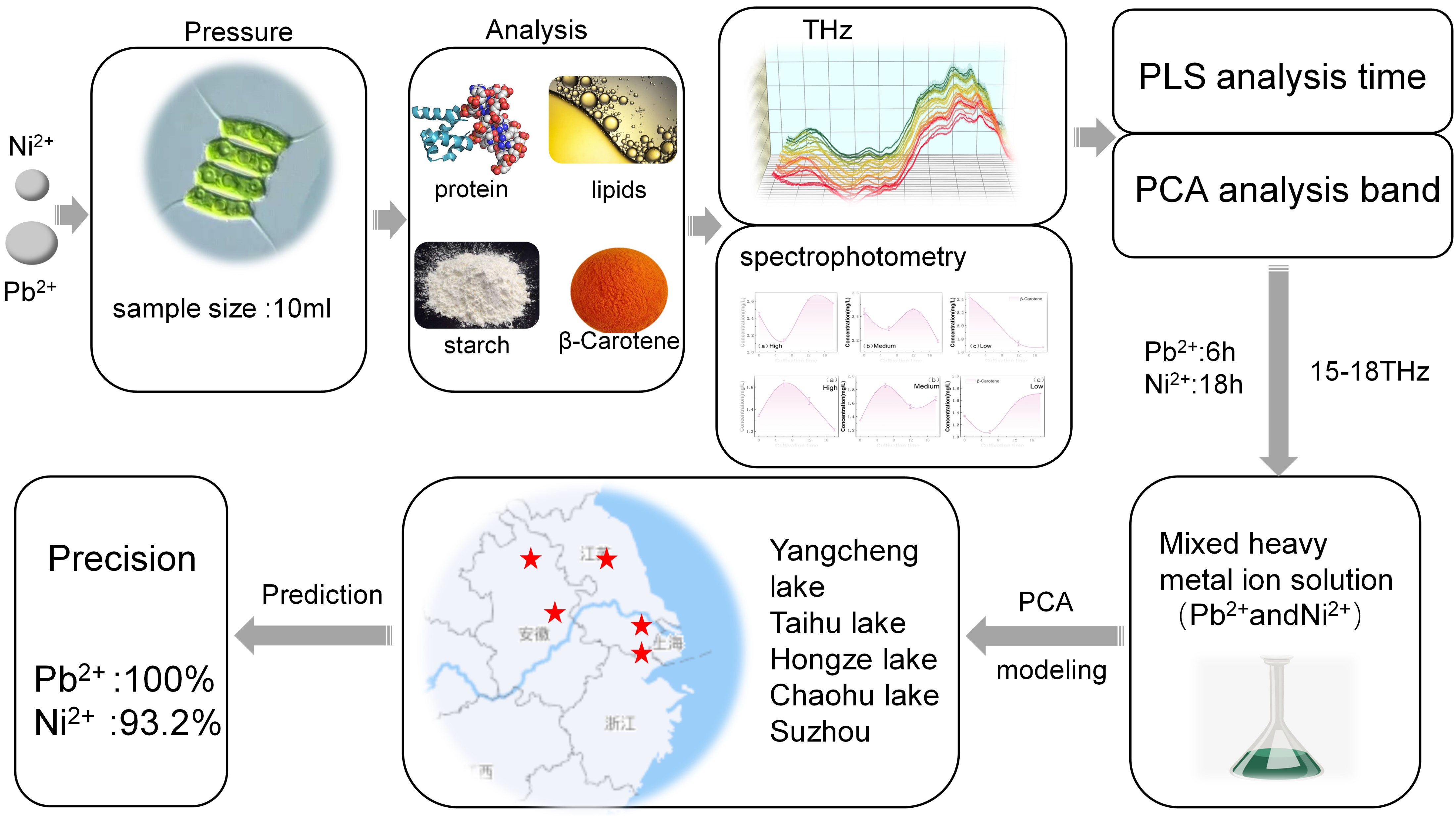 Compared with the traditional heavy metal detection method, the method proposed in this paper combined with terahertz technology with microalgae as the carrier does not require complex pretreatment, the sample size is only 10 ml, and the detection accuracy is improved to 0.001 mg/L, which provides a new technical support for the detection of the type and concentration of water weight metal. The advantages of the research are that it is in situ, rapid, and no pollution to the environment, which is conducive to real-time monitoring of water pollution, and at the same time can play the effect of purifying water through microalgae, which provides new detection ideas and methods for improving the detection of water weight metals.