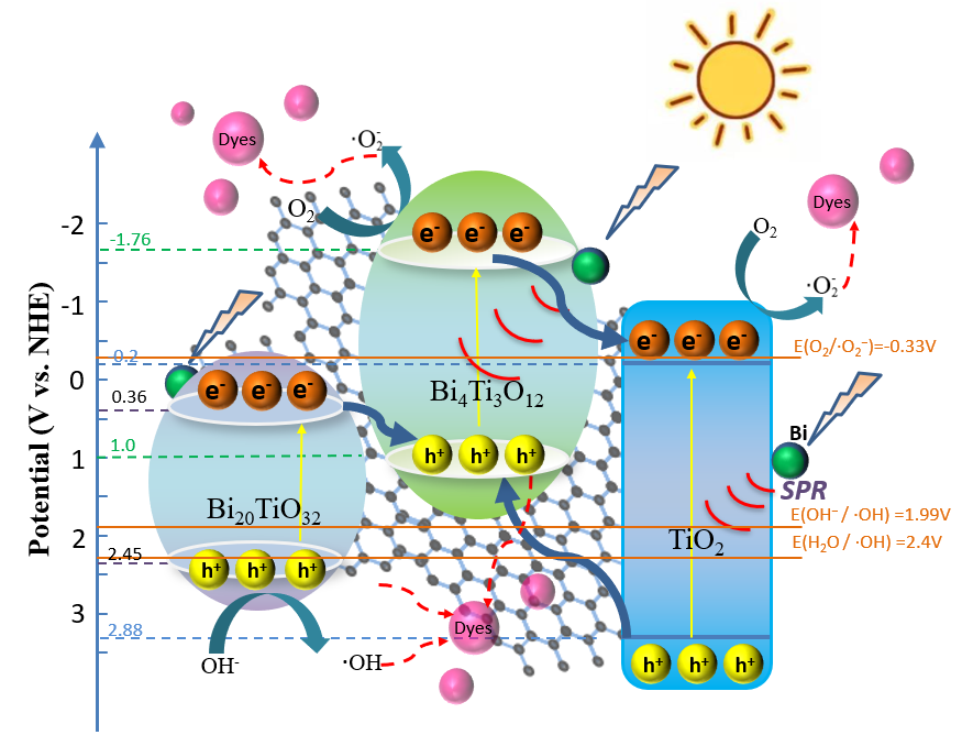 Schematic diagram of the photocatalytic mechanism of flexible photocatalytic carbon nanofiber composites (Bi/BixTiyOz-TiO2/CNFs)