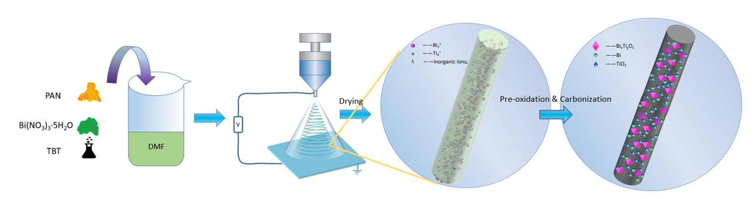 Schematic diagram of the preparation process of flexible photocatalytic carbon nanofiber composites (Bi/BixTiyOz-TiO2/CNFs)