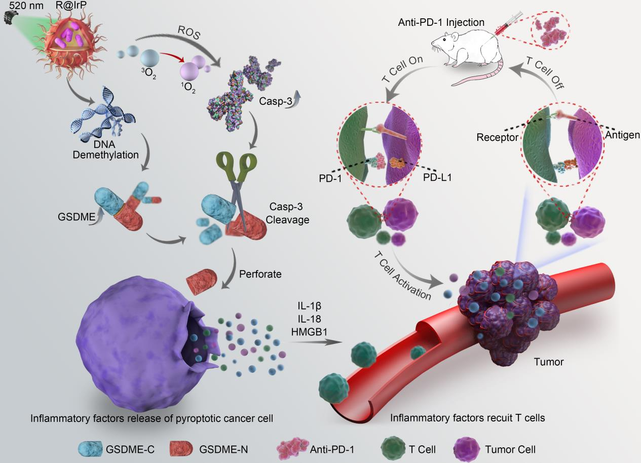 Photodynamic therapy is one of the most effective methods among many tumor treatment methods, which has the characteristics of non-invasiveness and low toxic side effects. As one of the methods of programmed death, cytopyrosis is most closely related to the body's immune system and is widely used in tumor immunotherapy. However, melanoma patients lack lymphocyte infiltration in their immune microenvironment, resulting in immune-boosting drugs that cannot exert their therapeutic effect, and this tumor is called "cold tumor". In this study, combined with the principle of photodynamic therapy and apoptosis, a nanophotosensitizer IrP with iridium complex as the matrix material was designed, which can stimulate cells to produce a large amount of reactive oxygen species under the irradiation of 520nm laser, induce the expression of the cell pyrozoosis-related protein Caspase-3, and use the self-assembly characteristics of IrP to further coat the demethylated drug RG108 to construct a photoimmune nanodrug-loaded system R@IrP and reconstruct the inflammatory microenvironment of the tumor site. Promote the body's immune cells to infiltrate the tumor site, convert melanoma from "cold tumor" to "hot tumor", and combine the synergistic treatment of immune checkpoint inhibitor anti-PD-1 to maximize the efficacy of immune checkpoint inhibitor, and its therapeutic effect is increased by about 95%, which solves the problem of the failure of immune checkpoint inhibitor anti-PD-1 when acting on "cold tumor", and provides a non-invasive and efficient means for immunotherapy of melanoma.