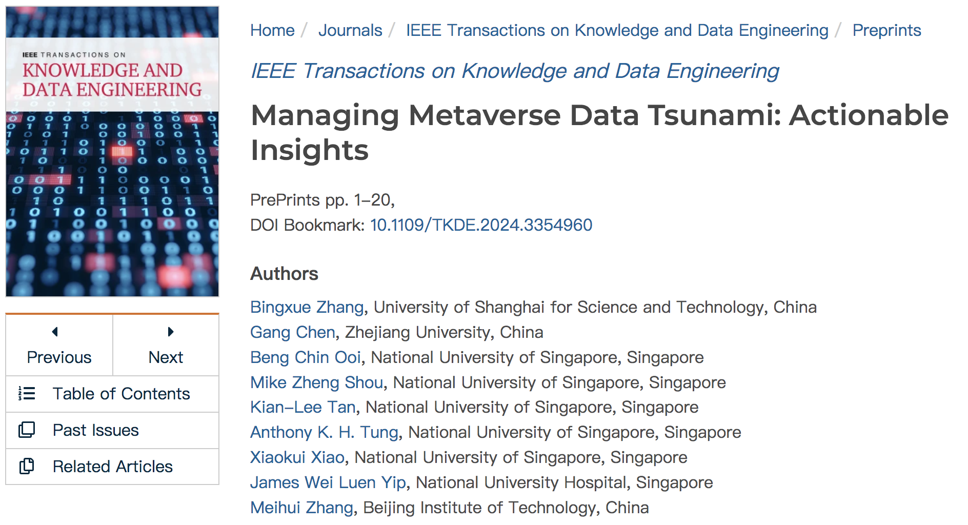 Recently, Associate Professor Zhang Xuebing from the University of Shanghai for Science and Technology, as the first author, joined hands with foreign academician of the Chinese Academy of Sciences, Professor Beng Chin Ooi from the National University of Singapore, Professor Kian Lee Tan, Dean of the School of Computer Science at the National University of Singapore, and Professor Chen Gang, Vice President of Zhejiang University. Published in IEEE Transactions on Knowledge and Data Engineering, a leading international journal in the field of computing, entitled "Managing the Meta-cosmic Data Tsunami: Feasible Insights "(Managing Metaverse Data Tsunami: Actionable Insights), Shanghai University of Science and Technology as the first unit.